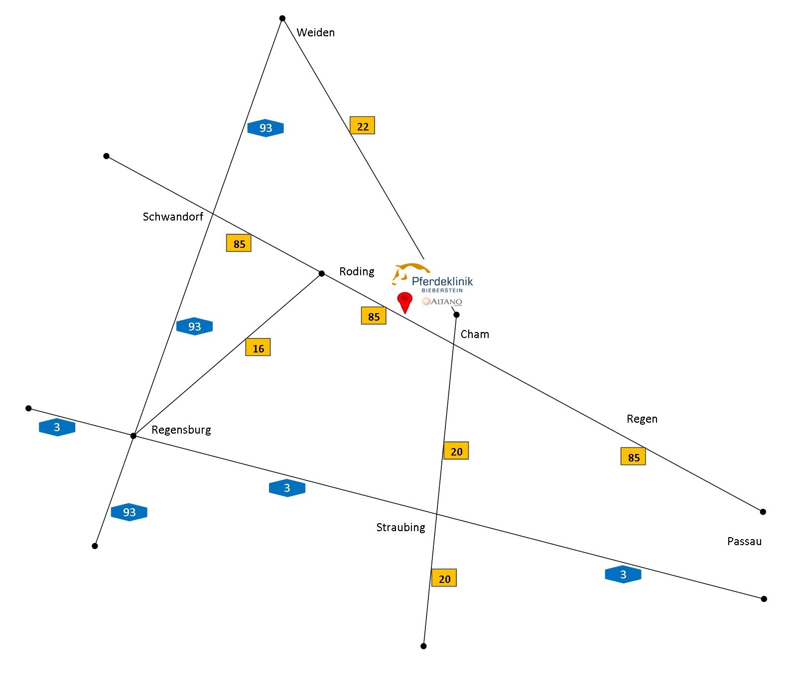 Dank unserer hervorragenden Verkehrsanbindung erreichen Sie uns unkompliziert über die B 85 (Ausfahrt Untertraubenbach oder Cham West). Wir wünschen Ihnen eine gute und entspannte Anreise zu unserer Klinik.